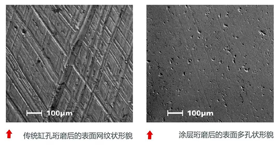 缸孔涂层在珩磨后形成具有开放且分散的多孔表面。正是这些平缓圆整的小孔减小了燃油在燃烧室和活塞环的暴露面积;同时减轻了刮油环的切向力,使活塞环更顺畅地进入流体动力学状态,显著降低摩擦阻力和磨损,从而进一步降低油耗和窜气的可能性。